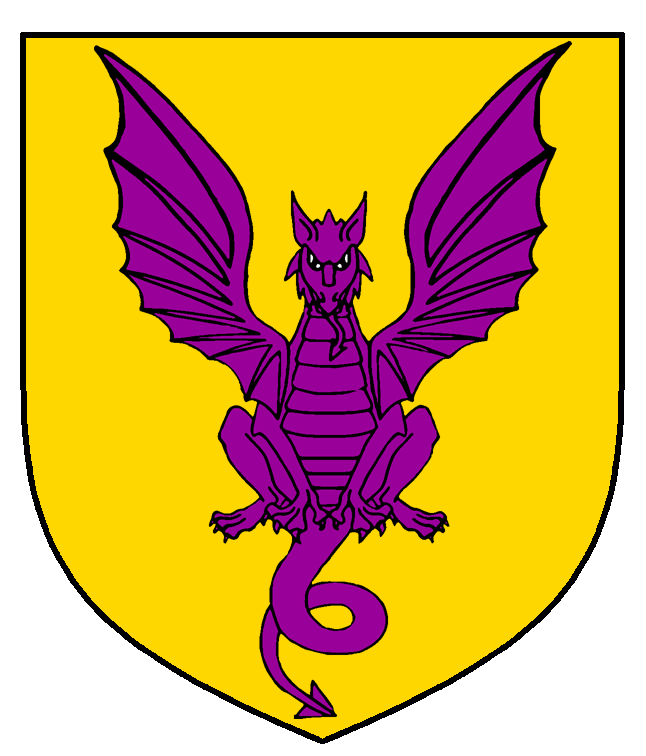 - Device: Or a Dragon Sejant Affronty Wings Displayed Purpure. (Ulvar draws his dragon like a What's New Dragon.)